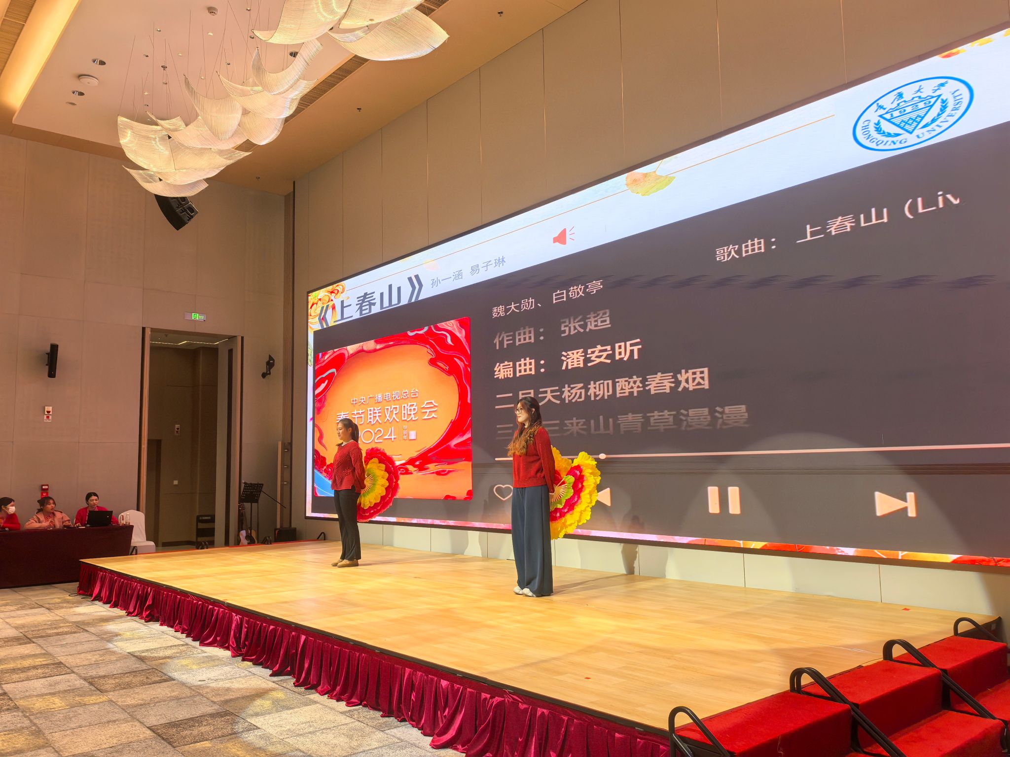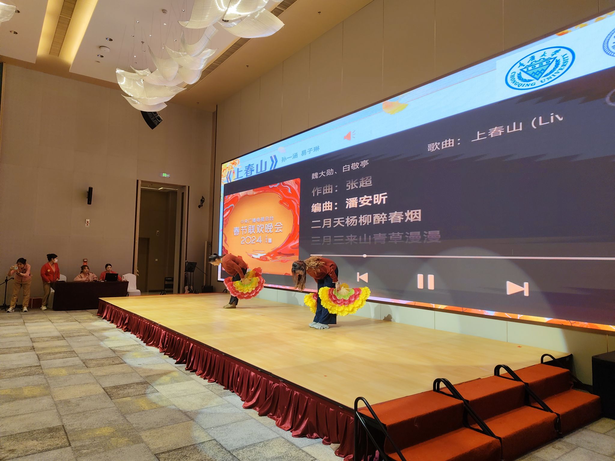 随后,舞扇表演环节将活动氛围推向高潮。两位志愿者手执色彩绚丽的折扇,伴着智能音响精准控制的古典旋律翩翩起舞。尽显青春活力与传统文化之美。同学们舞动的不仅是青春的朝气,更是青年工程师用 “精准服务” 传递的深切敬意与温情。