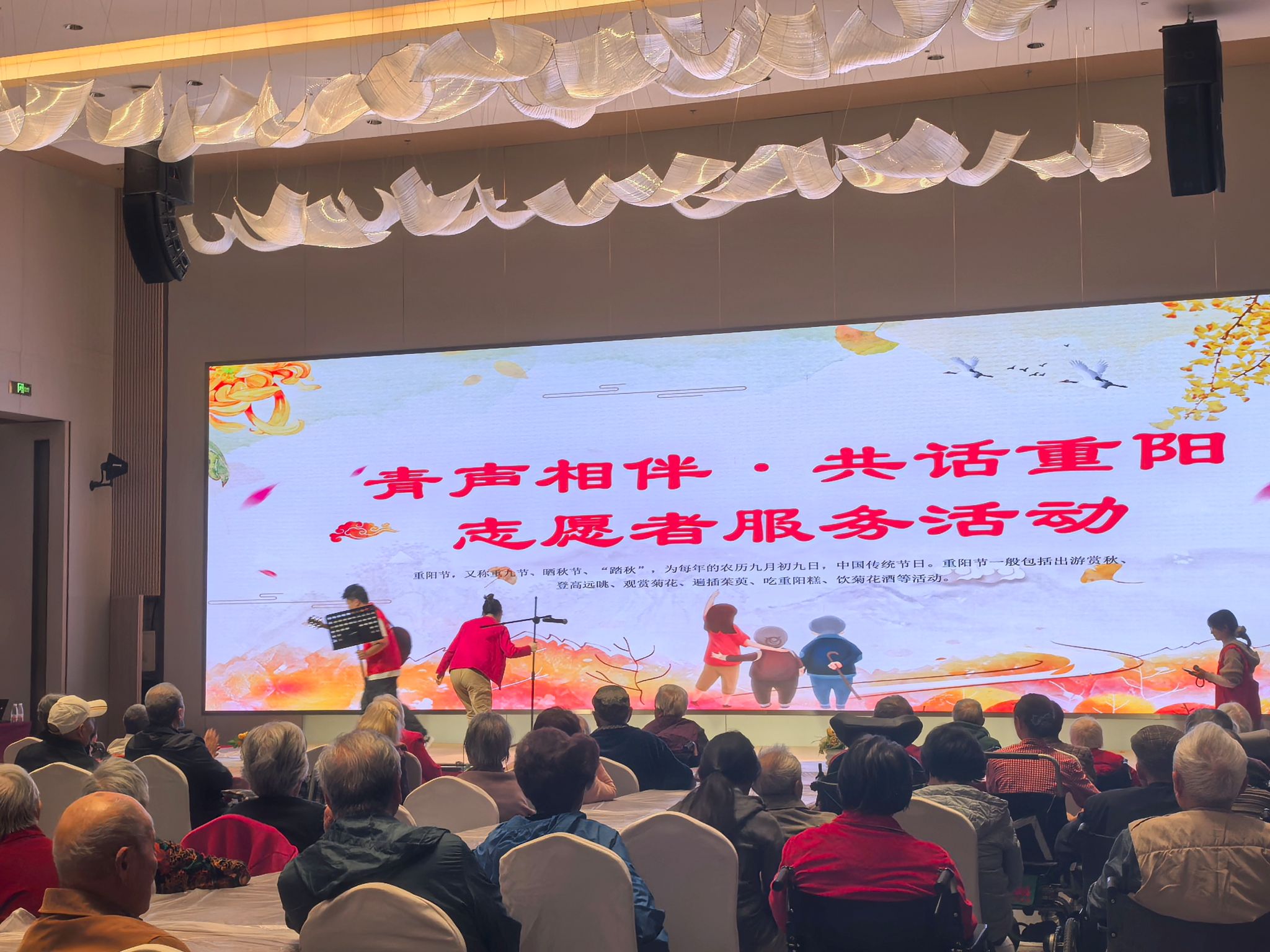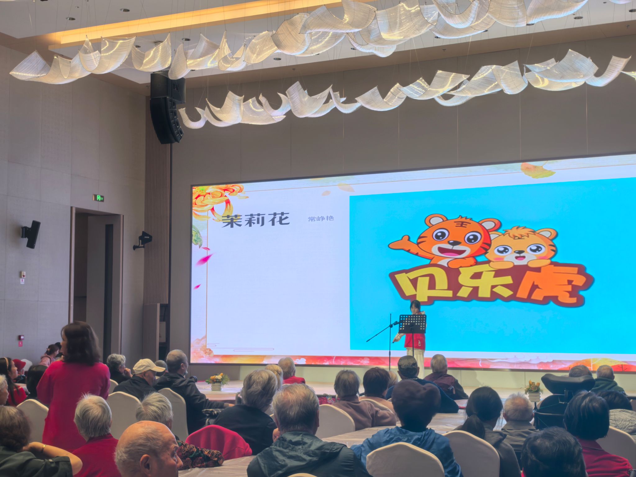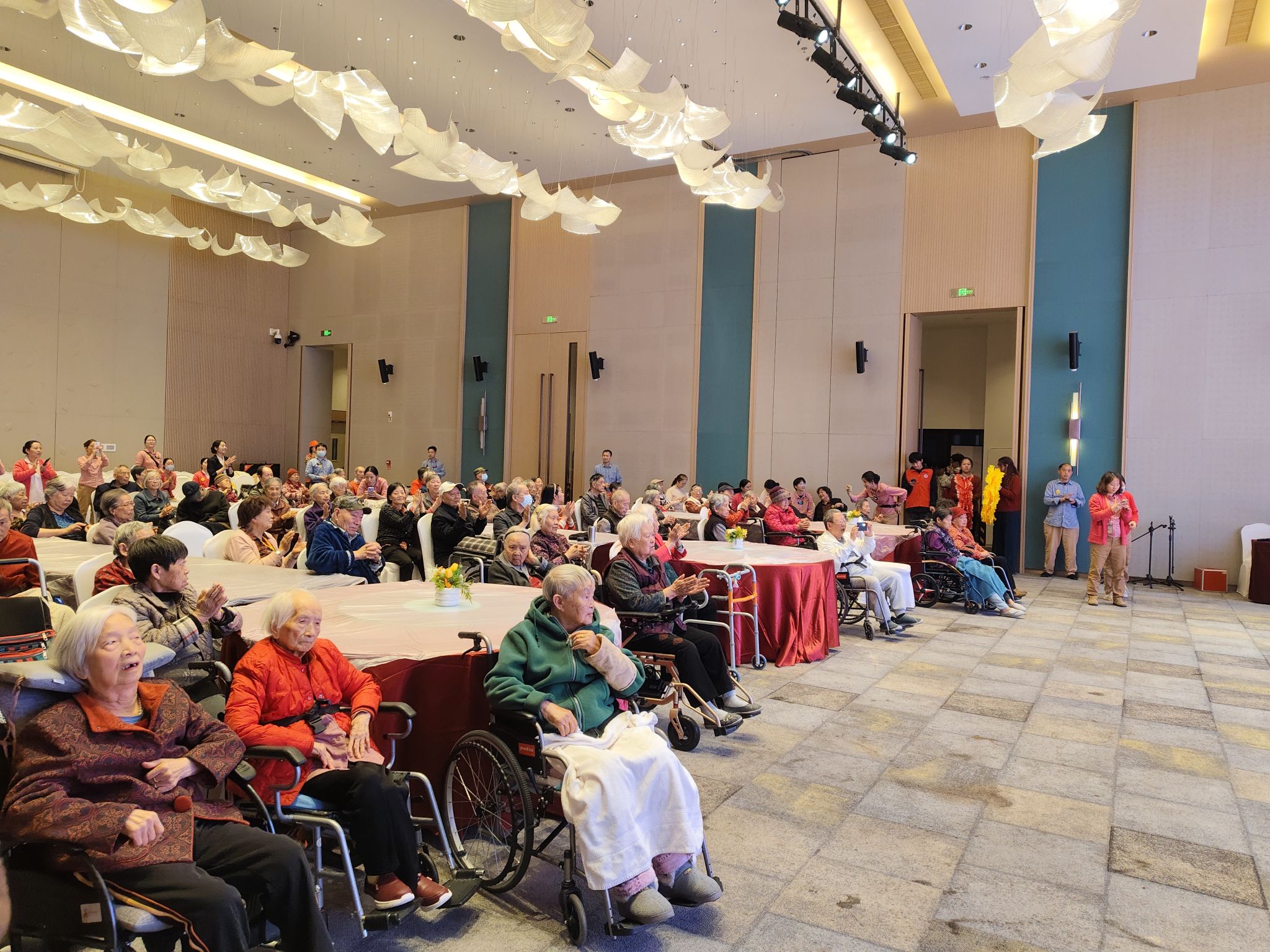 活动筹备阶段,志愿者团队充分发挥工科生严谨细致的特质,提前抵达现场制定 “分工清单 + 应急方案”:从智能音响调试、光影氛围营造,到手工物料分类、书法工具消毒,每一个环节都经过反复核对,尤其针对老年群体需求优化现场动线设计,确保活动安全、顺畅。活动在欢快经典的老歌中正式拉开帷幕。志愿者与长者们围坐成圈,伴着清晰柔和的旋律轻声哼唱,《茉莉花》《我和我的祖国》等曲目接连响起。悠扬的歌声里,满含着青年一代对长者的敬意,悄然柔化了时光的痕迹,也让代际之间的距离在默契的和声中渐渐消融。