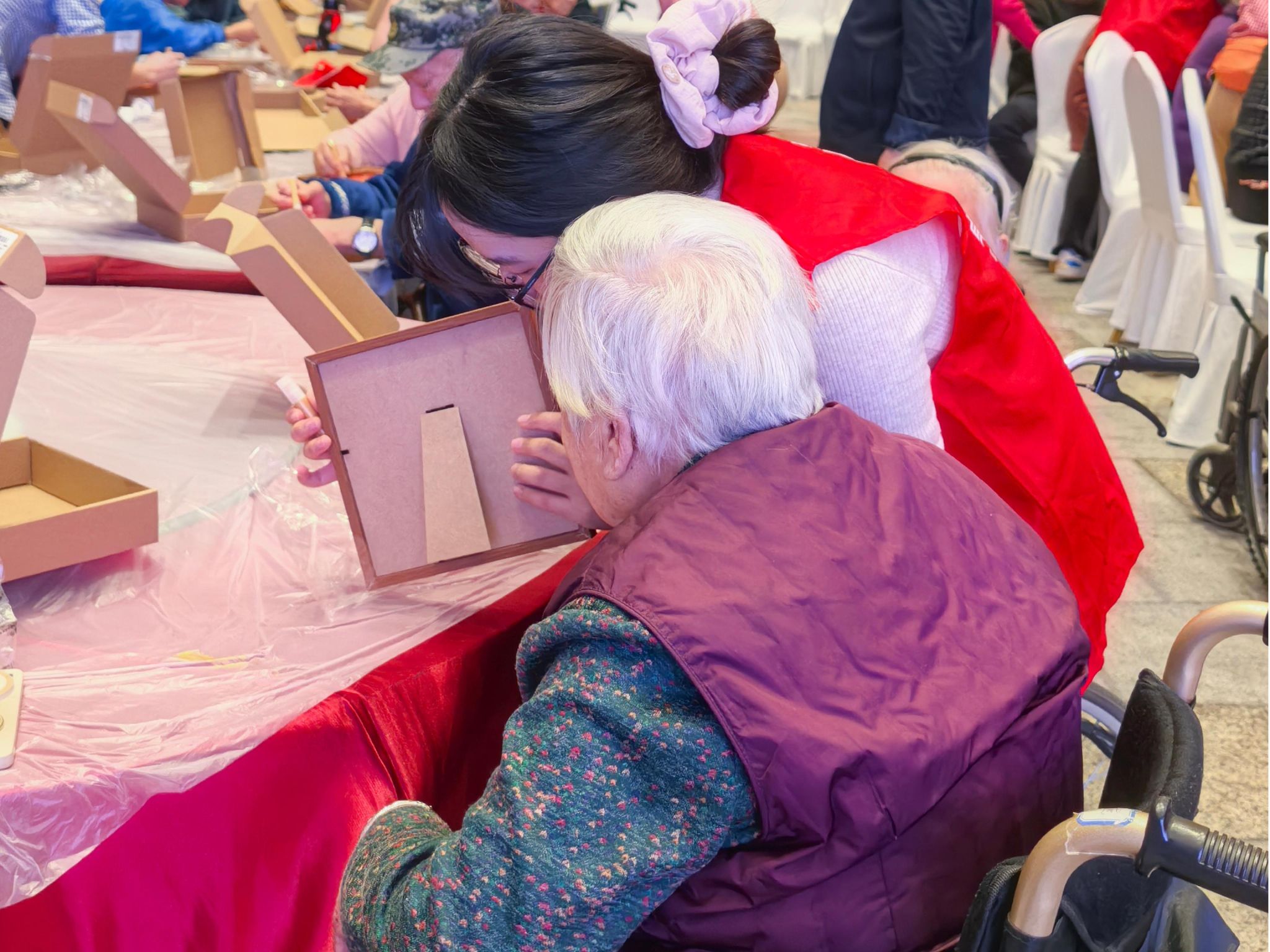 歌声渐歇,“墨香伴智能” 互动环节接力登场。志愿者们不仅耐心引导长者铺展宣纸、研磨墨汁,手把手教授书法基本笔法,更带来了简易科技体验 —— 用平板电脑展示书法名家作品动态演示视频,通过AI让长者清晰观察笔画走势;手工制作环节中,志愿者还借助手机摄影的 “实时取景” 功能,帮助长者调整剪纸角度,让传统手艺与现代科技巧妙融合。