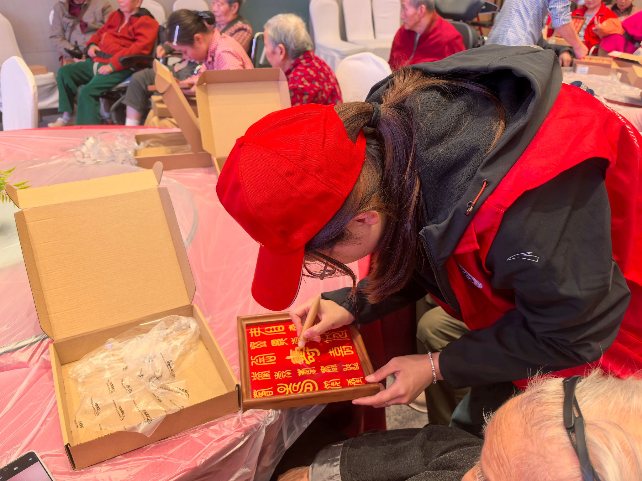 挥毫泼墨间,长者们笔下的 “福”“寿” 二字笔力沉稳、韵味悠长,每一笔都透着对生活的热爱;巧手翻飞中,剪纸、折纸作品在镜头辅助下更显精致,色彩鲜艳的纸张在指尖流转成寓意吉祥的图案。现场墨香袅袅、笑声阵阵,科技工具与传统技艺碰撞出独特乐趣,勾勒出一幅充满温情与智慧的秋日生活画卷。